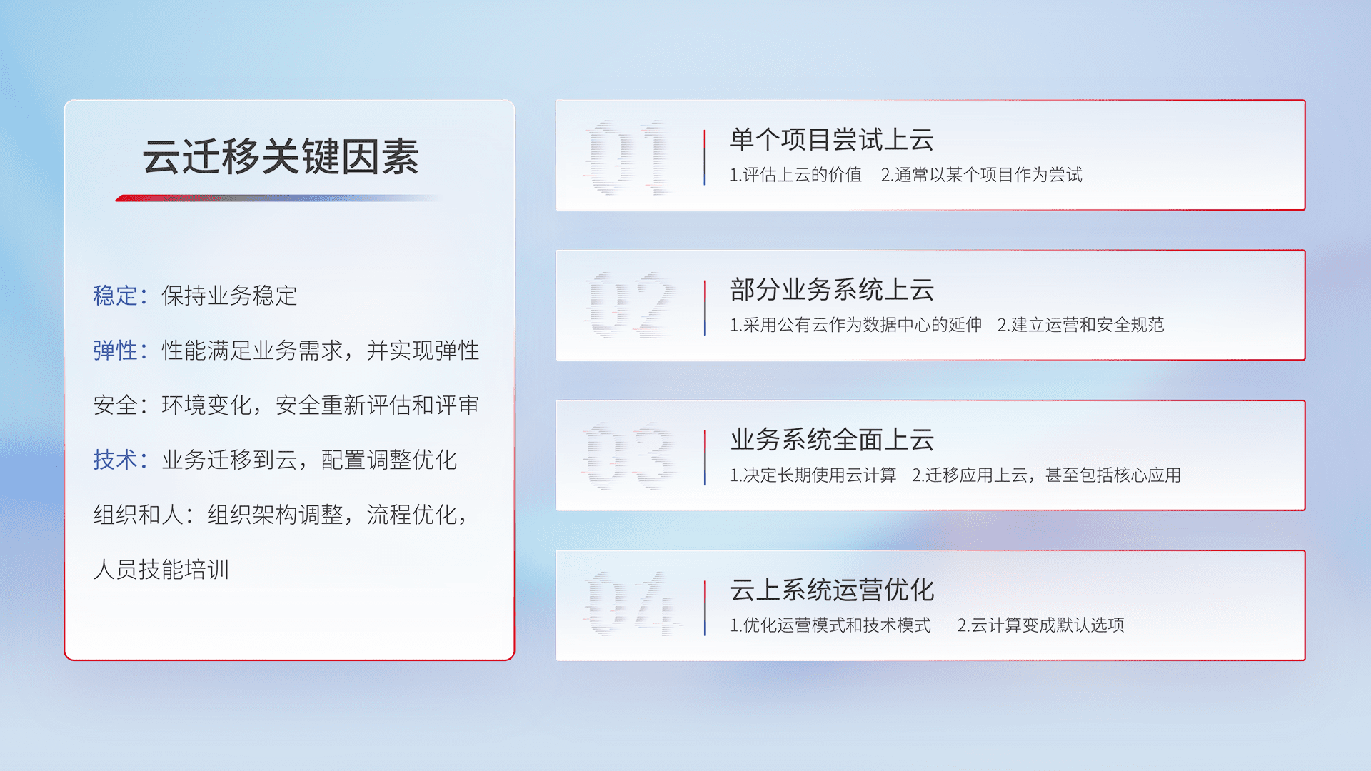 结合实际业务,,,从规划设计、、云平台选型、、云原生改造、、数据迁移、、集成交付,,,迁移全过程为客户识别最佳上云路径,,,做好风险识别管理,,,设计网络架构、、、、身份权限、、、安全审计合规、、、、操作审计、、、、日志审计、、监控告警策略、、、多站点容灾设计等,,,对云上基础设施进行整体规划,,提升IT治理水平,,,,以满足弹性、、、高可用、、高性能的需求。。。