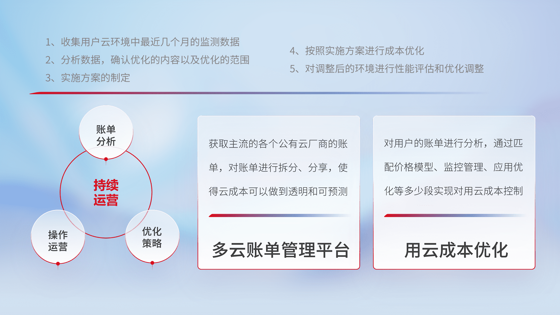 通过多云纳管,,,以统一的资源数据模型把客户的云资源进行抽象和封装,,,进而实现对多云资源的统一操作,,保障云资源管理的可靠性、、、、稳定性与可用性。。。量身定制化运维内容,,配置、、、、开发运维、、、补丁管理、、备份、、、监控、、、、认证和访问管理、、、、审计和日常巡检等,,保障在用云过程中的可靠度,,,稳定度以及高可用率。。。