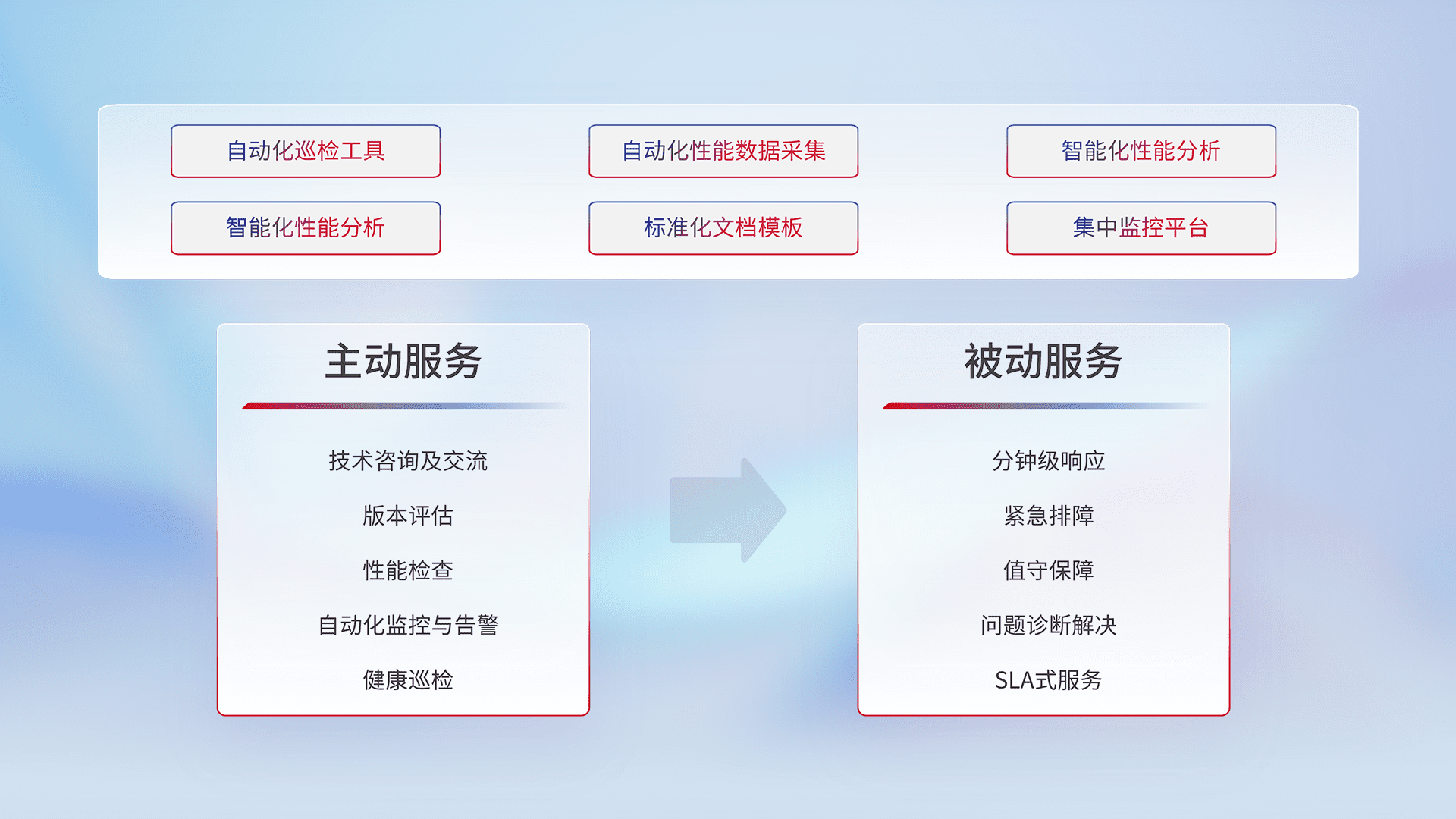 智能化工具和标准化文档,,,,保障服务质量,,提供主动服务(包含技术咨询、、版本评估、、、、性能检查、、自动化监控与告警、、健康巡检)和被动服务包含(分钟级响应、、、、紧急排障、、、值守保障、、、问题诊断解决、、SLA服务)。。。