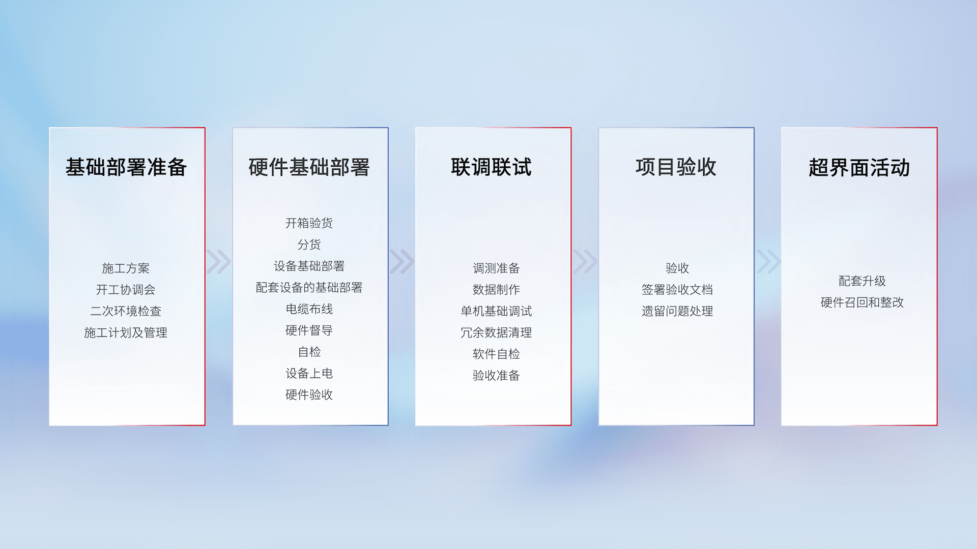 从基础部署准备、、、硬件基础部署、、、、联调联试、、、项目验收、、越界面活动的全过程可追溯,,保证施工质量和进度。。。。